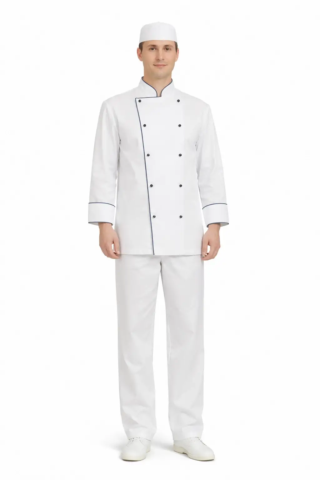 Muška kuharska bluza dvoredno kopčanje namijenjena je profesionalnim kuhinjama gdje su zaštita i uredan izgled prioritet. Klasičan kroj i kontrastni detalji daju joj ozbiljan i prepoznatljiv karakter.