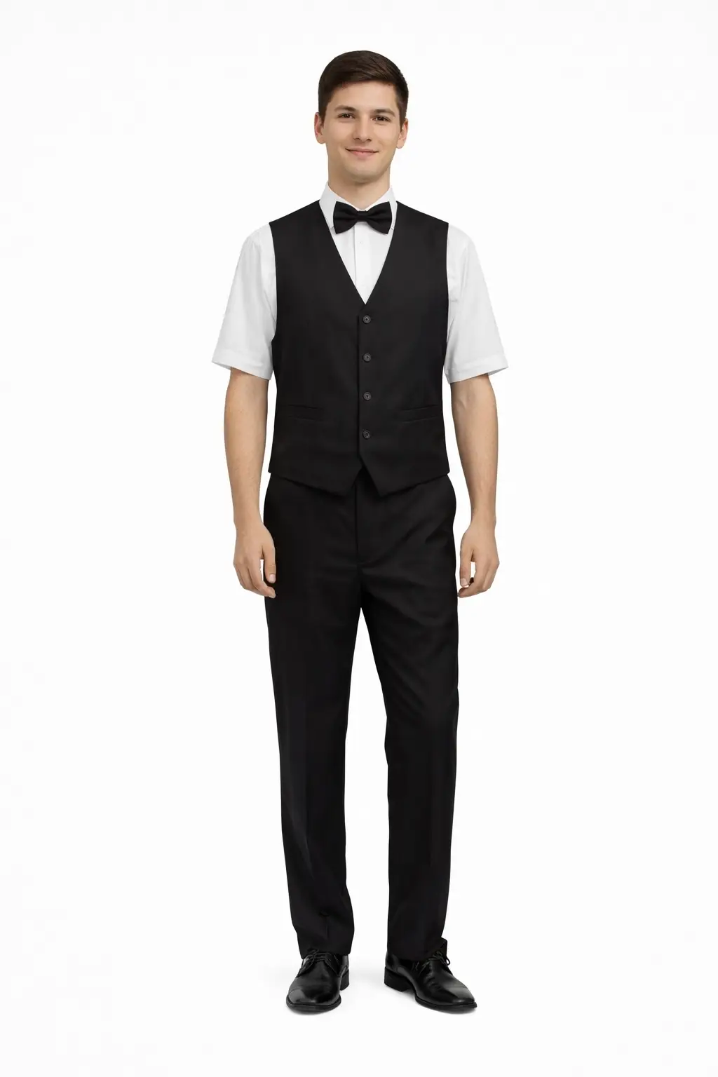 Muški konobarski prsluk namijenjen je radu u restoranima, hotelima i na svečanim događanjima gdje je važan uredan i profesionalan izgled. Klasičan kroj daje ozbiljan dojam i lako se kombinira s košuljom i hlačama.