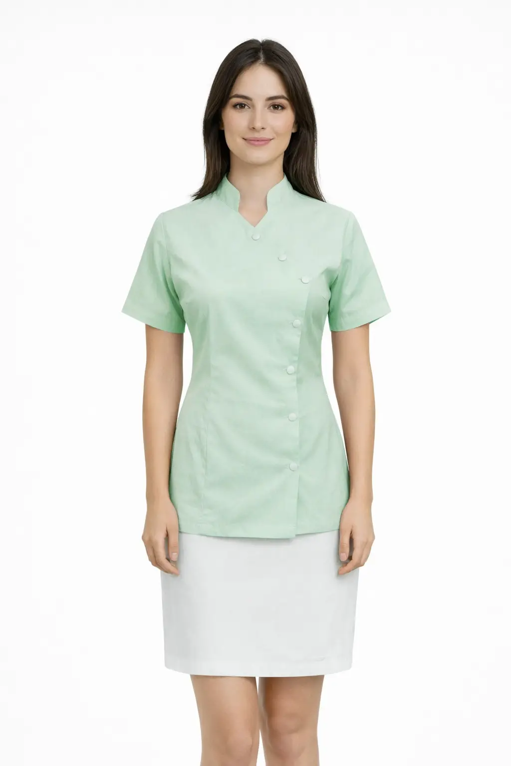 Visoka kragna daje modelu čist i moderan karakter. Kopčanje sprijeda je diskretno i praktično, što olakšava oblačenje. Kratki rukavi omogućuju slobodno kretanje i udobnost pri radu s pacijentima ili klijentima.