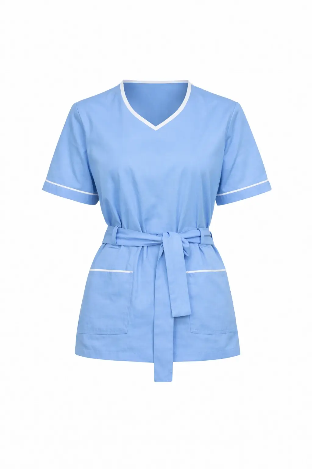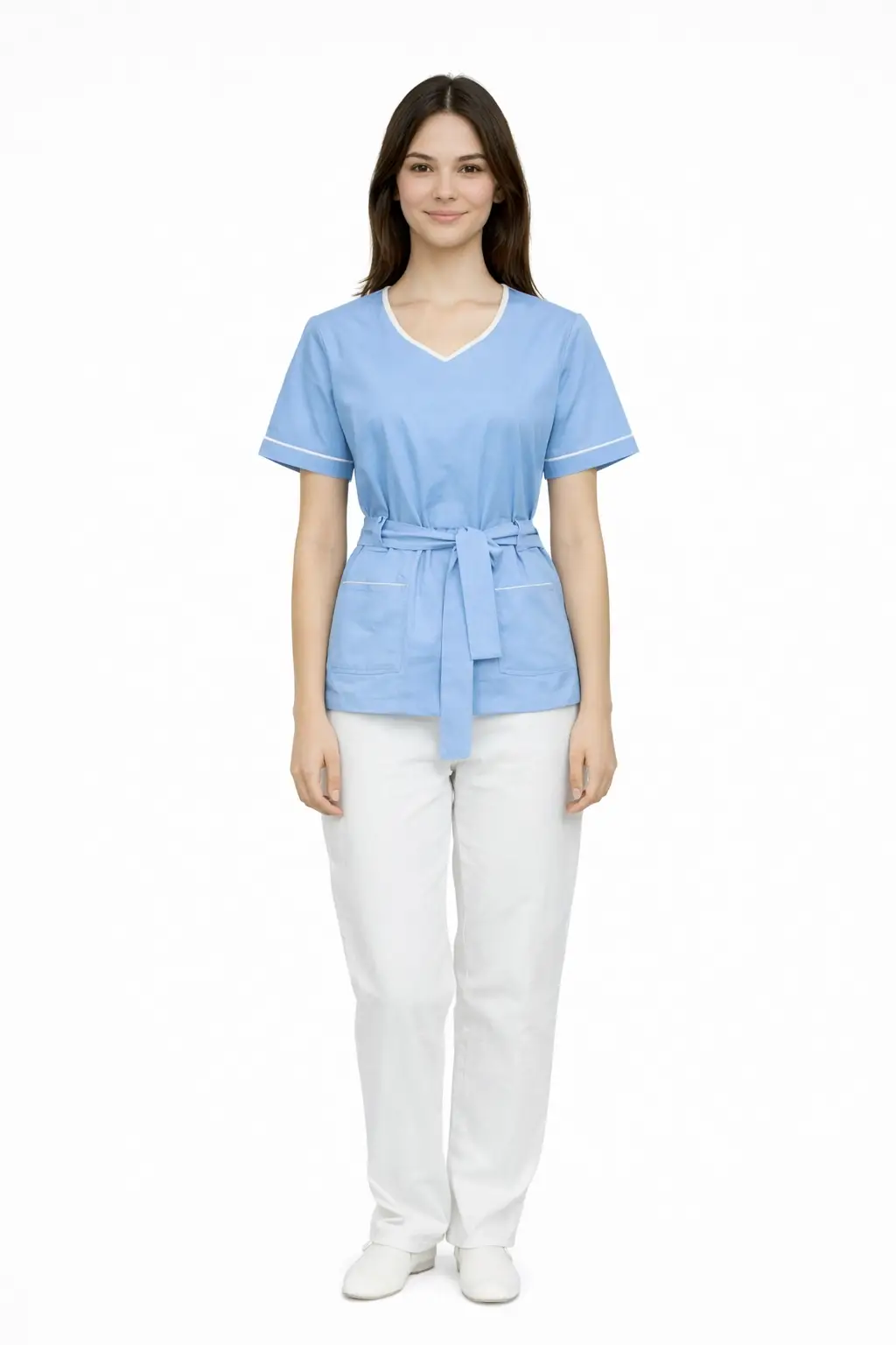V izrez s diskretnim obrubom vizualno izdužuje vrat i daje lagan, moderan dojam. Kratki rukavi omogućuju slobodno kretanje tijekom cijele smjene. Struk se može prilagoditi vezanjem, čime bluza dobiva ženstvenu siluetu bez osjećaja stezanja.