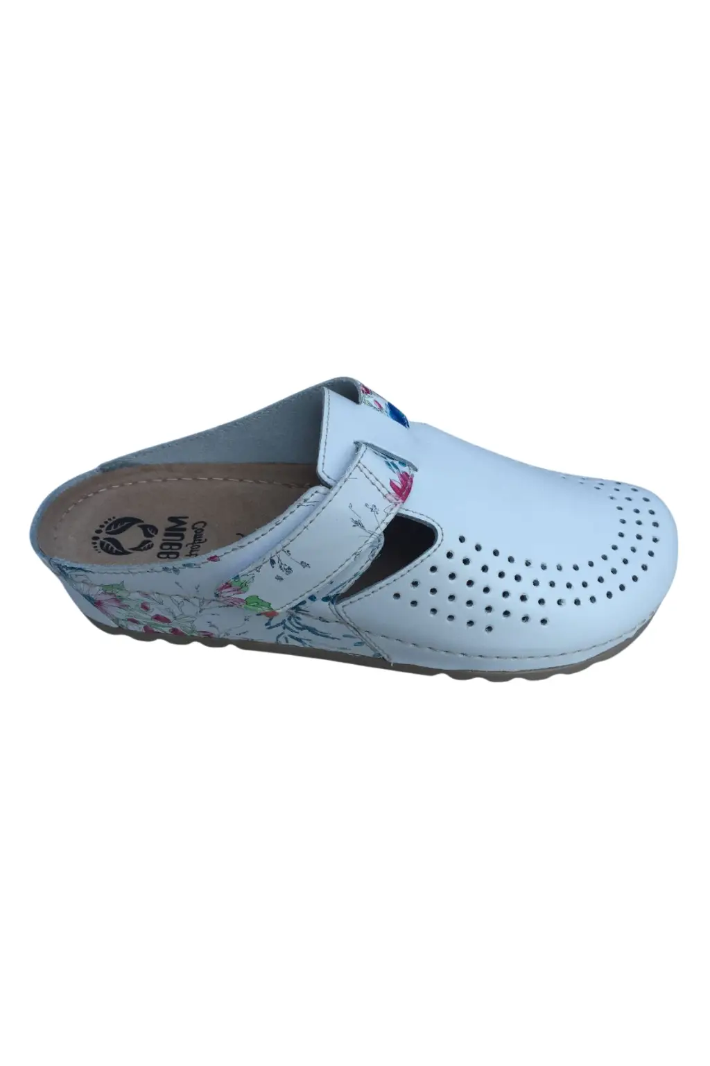 MUBB 888 ženske klompe, bijele s cvjetnim uzorkom i podesivim remenom za širinu stopala